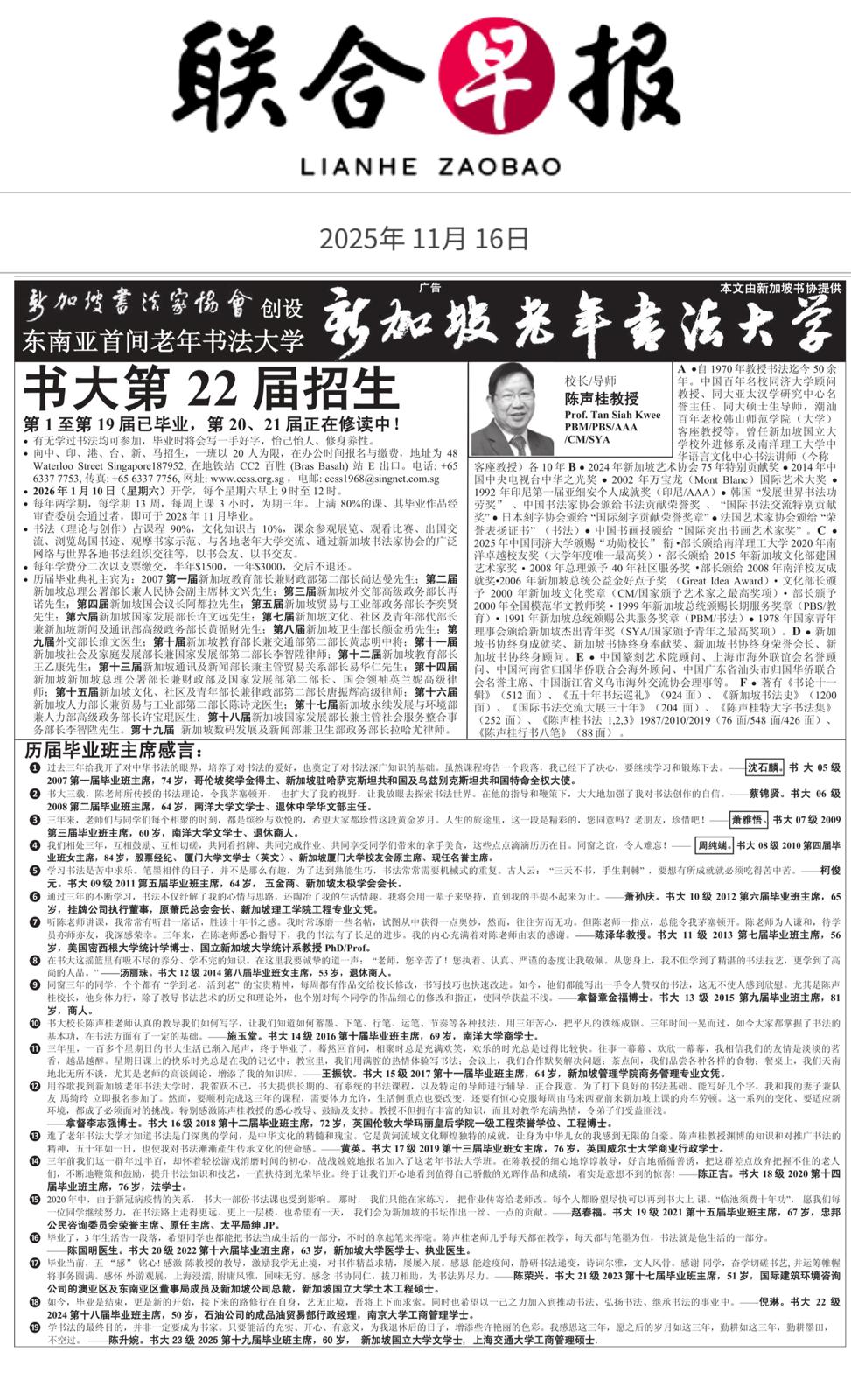 的确,新加坡老年大学的创立,已为年长人士丰富优雅生活、发展中华文化、弘扬书法艺术、促进国际书法交流等方面,作出了贡献。